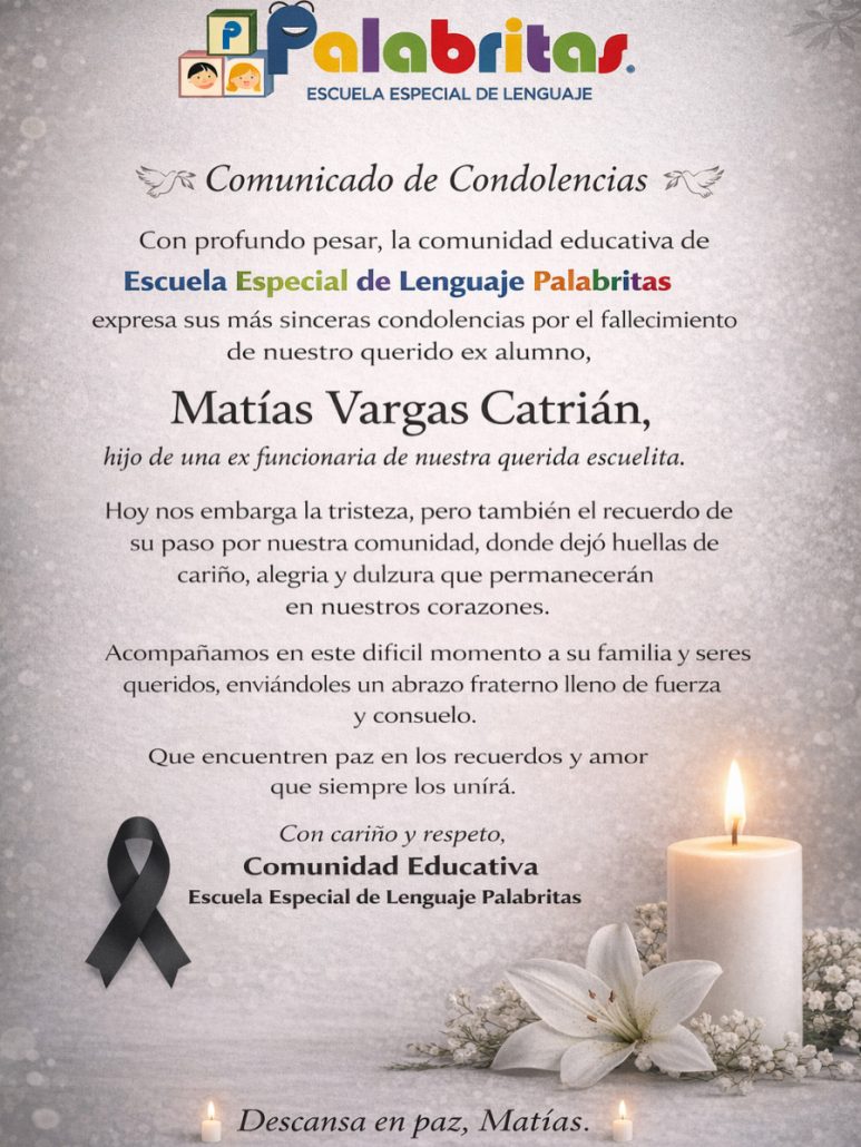 Con profundo pesar, la comunidad educativa de la Escuela Especial de Lenguaje Palabritas lamenta el sensible fallecimiento de nuestro querido ex alumno, Matías Vargas Catrián, hijo de una ex funcionaria de nuestra institución.
